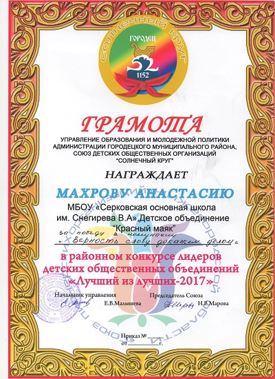 15 марта 2017 год. Прошел традиционный районный конкурс лидеров ДОО "Лучший из лучших". Пионерскую дружину "Красный маяк" представляла заместитель председатнля Совета дружины Махрова Анастасия. программа конкурса включала в себя написание эссе "Мой друг и товарищ вожатый", разработку социального проекта, проведение игровой программы, видеоролик "Наше главное дело" и самопрезентацию. Анастасия стала победителем в номинации "Верность слову докажем делом". (В общем зачете - 2 место.)